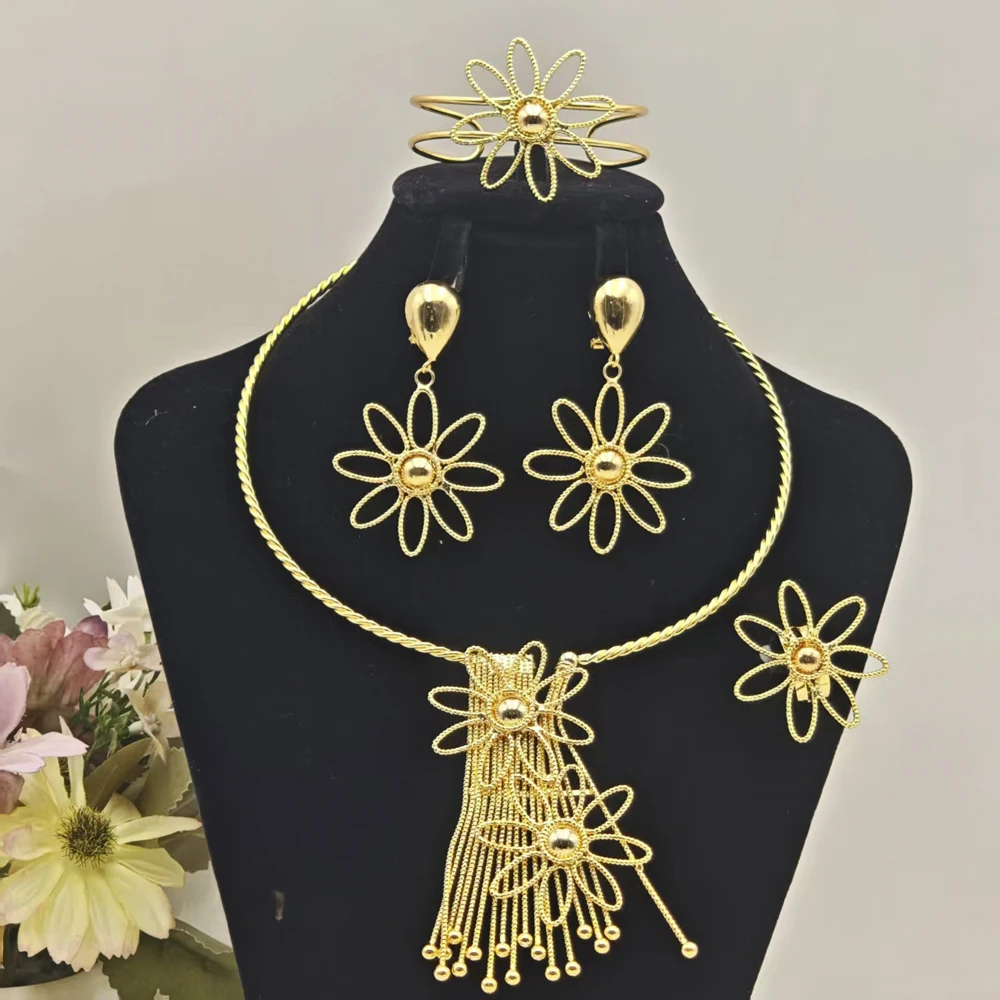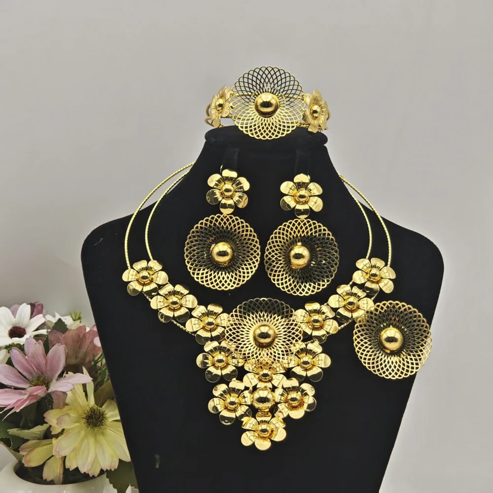 Dubai Woman Big Jewelry Set Nigeria Gold Plated Earrings Necklace Hollowed Out Flower Design Bride Bangle Rings Mother's Day
