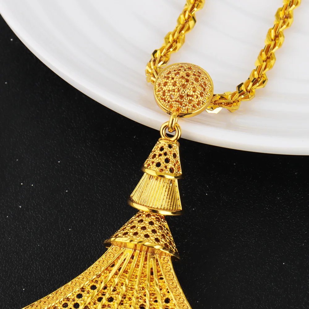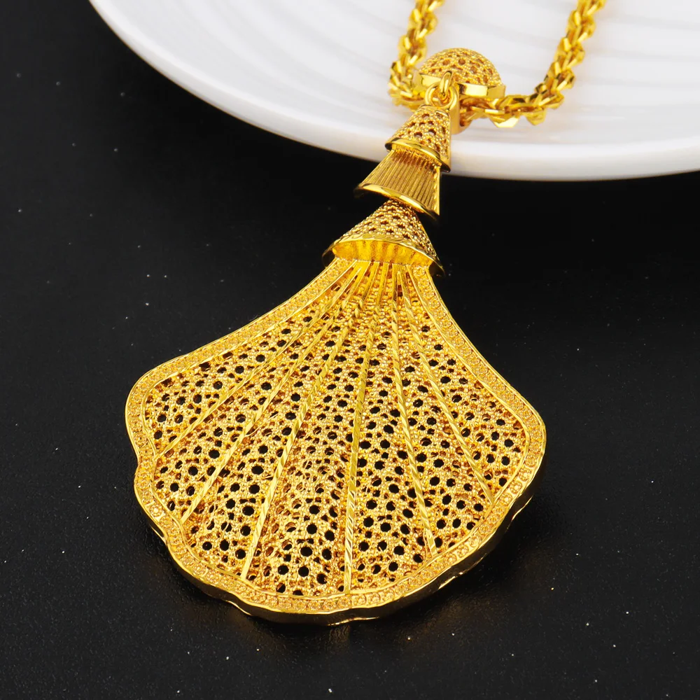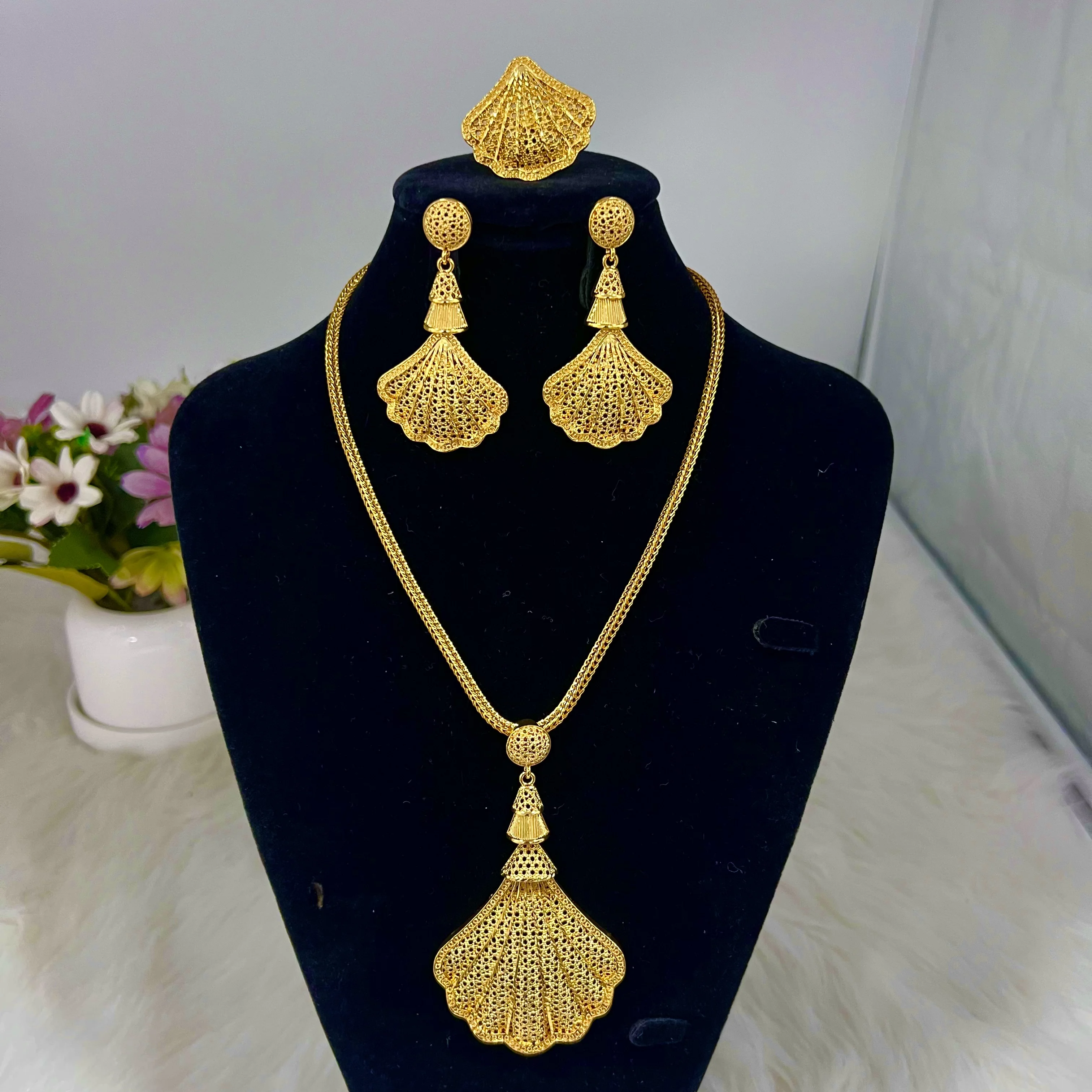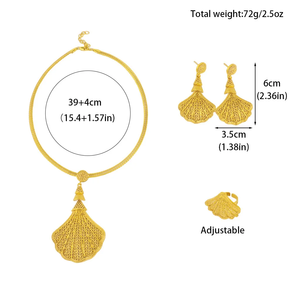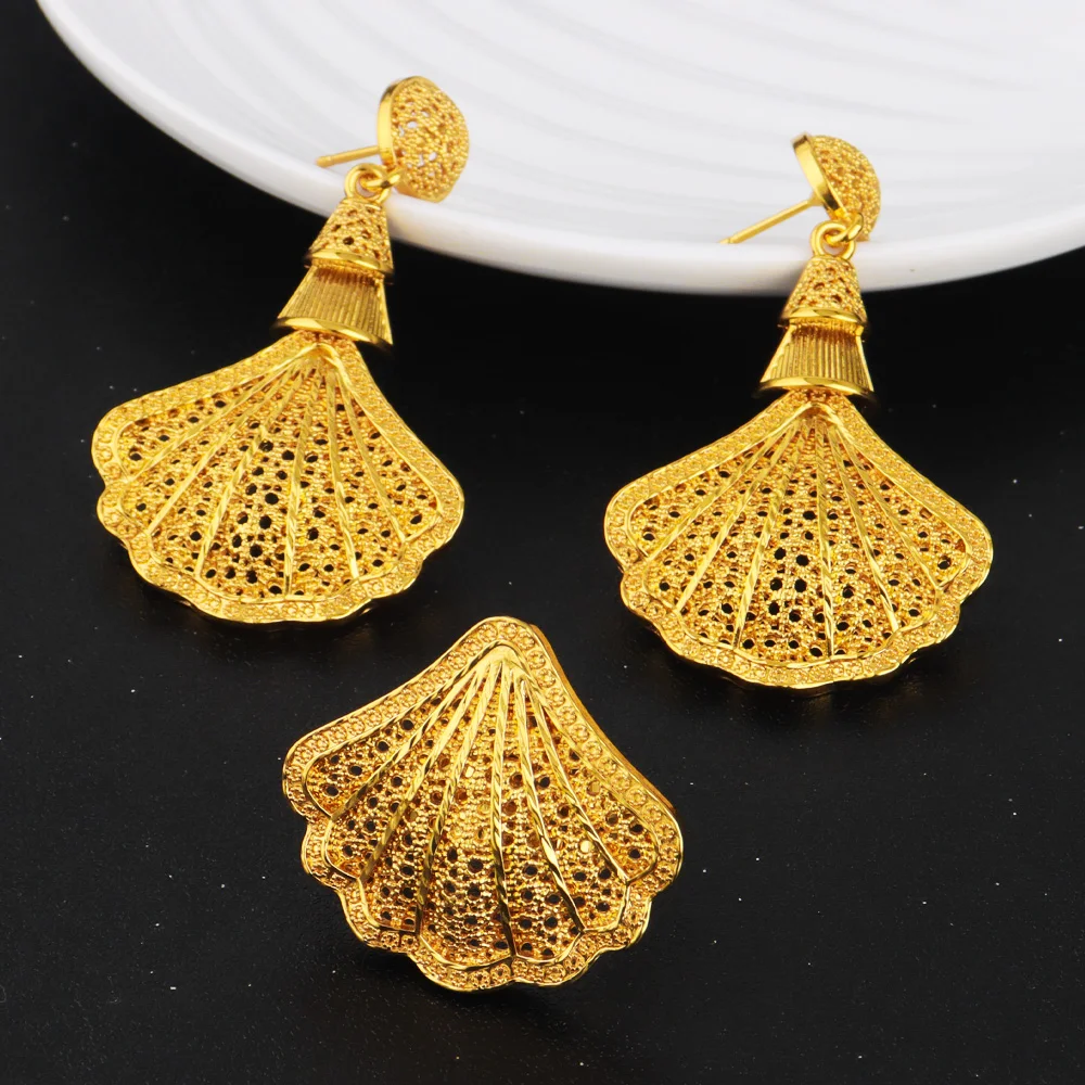 Luxury Gold Plated Sea Shell Shape Necklace Earrings Ring Set for Women Nigeria Elegant Design Jewelry for Party Wedding